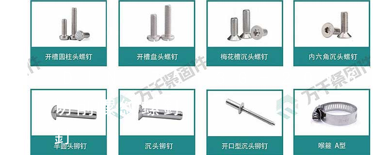 1、頭部形狀頭部形狀各式各樣。有圓頭(半圓頭)、扁圓頭、圓頭凸緣(帶墊)、扁圓頭凸緣(帶墊)、盤頭、盤頭凸緣(帶墊)、沉頭、半沉頭、圓柱頭、球面圓柱頭、喇叭頭、六角頭、六角法蘭頭、六角凸緣(帶墊)頭等。2